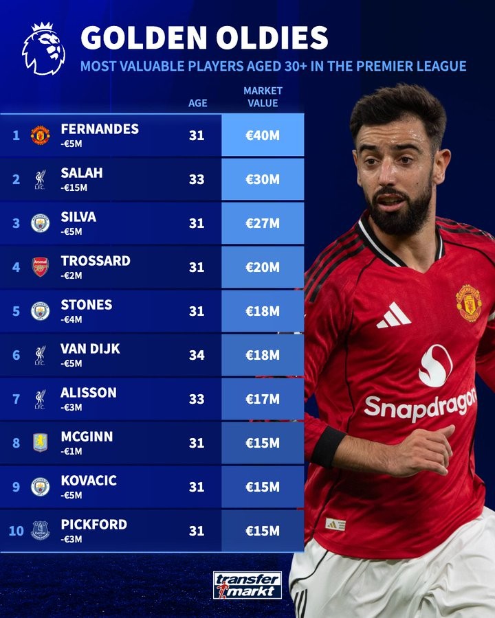 德轉列英超30+歲球員身價榜:B費4000萬歐居首,薩拉赫第二